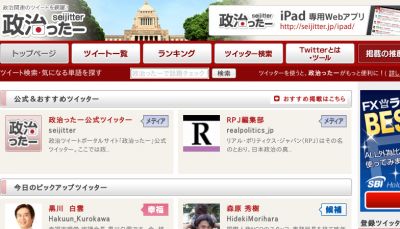 ネット選挙見送りでも、充実する選挙関連サイト参院選ではネット選挙の解禁が見送られましたが、ネットでは政治に関するサイトが色々と開設されています。